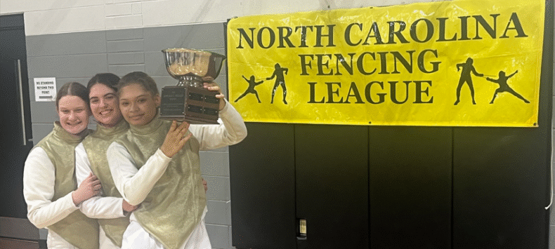 Salem Academy’s foil team–Vanity McIlwain ’29, Grace McPhail ’26, and Erica Heuser ’29–claimed first place at the North Carolina Fencing League State Team Championships on Saturday, February 7, 2026, earning the state championship title after a dominant performance against teams from six other North Carolina schools.